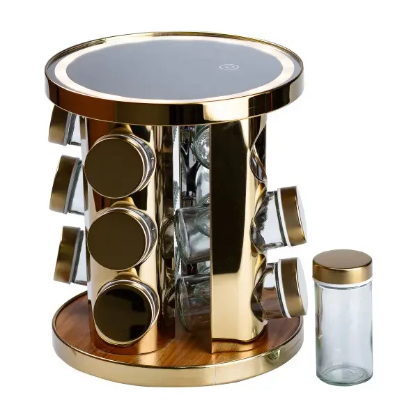 Набір баночок для спецій — це не просто практичний інструмент для зберігання, але й стильний елемент декору вашої кухні. Він складається з 12 баночок по 100 мл з золотистими кришками, а також дзеркальної підставки з LED-підсвіткою. Набір баночок для спецій — це універсальне рішення для зберігання ваших улюблених спецій. Він стане вашим незамінним помічником на кухні.